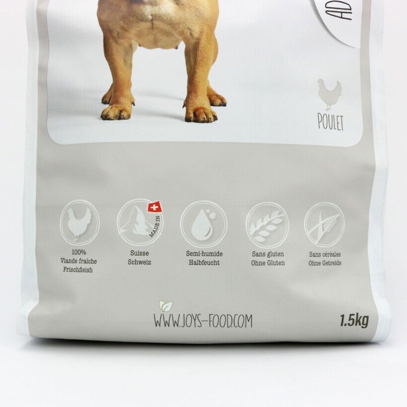 Joy’s Food à base de 72% de viande de poulet frais suisse et de pommes de terre. C’est la collation ultime sans céréales, sans gluten et sans lactose ! Le processus de fabrication spécial répond à une biodisponibilité et à une tolérance maximale.